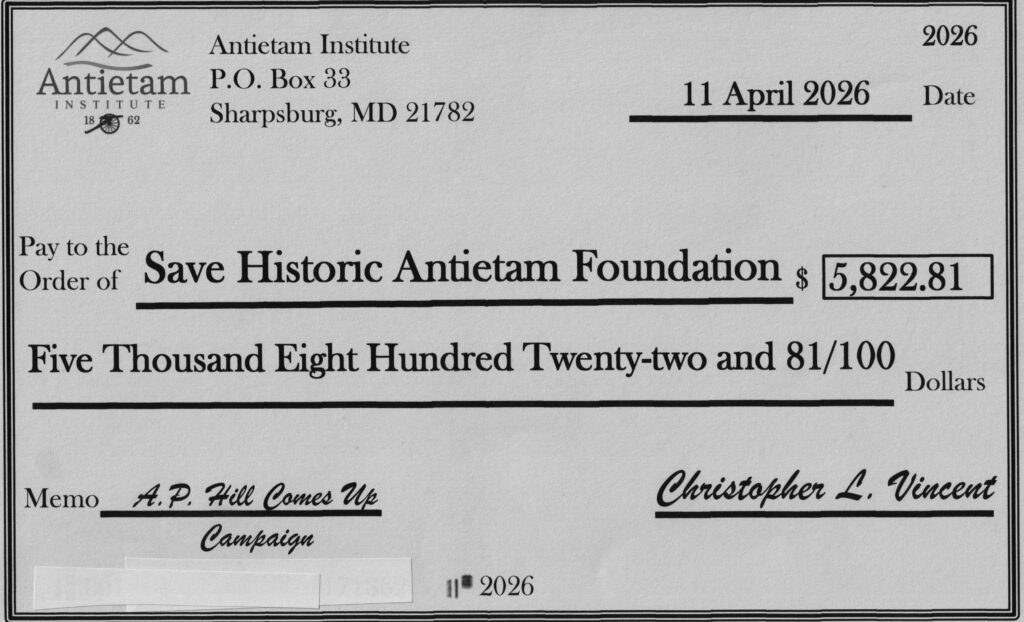 At their Spring Conference, the Antietam Institute graciously and generously donated $5,822.81 to SHAF for our recent purchase of the property and house on Harpers Ferry Road. The Institute has been very supportive of our efforts and we thank them profusely for their support. Their Fall Conference will take place October 9 – 11 and will focus on the West Woods fighting during the battle of Antietam. For more information about their fall conference, visit https://antietaminstitute.org/2026-fall-conference/.